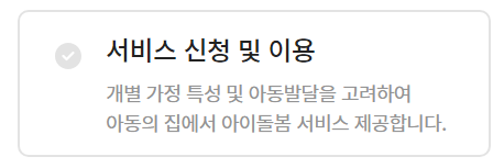 | 서비스 신청 | 긴급돌봄: 희망하는 일정 서비스 신청 및 작성 | 단시간돌봄: 4시간이후 부터 1시간으로설정 |
